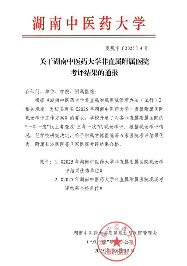湖南中医药大学定期对各家非直属附属医院开展“一年一考评、三年一现场”的严格评估。专家组从医院管理、教学培养、科研创新、学生发展等多个维度进行全面考核,确保每家附属医院都具备高水平的医教研协同能力。