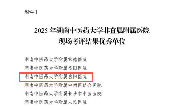近日,在湖南中医药大学开展的2025年度非直属附属医院综合考评中,岳阳市中医医院交出亮眼成绩单,拿下了“优秀”等级!这一荣誉,是对医院在医疗、教学、科研实力的综合肯定。更是岳阳市民身边优质医疗资源的实力印证。
